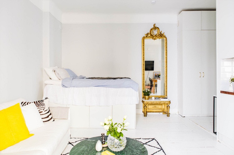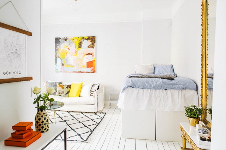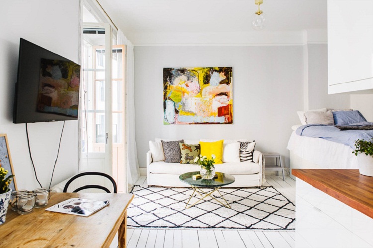 Với những căn hộ nhỏ như thế này thì thiết kế không gian mở là lựa chọn chính xác nhất. Song dù thế nào đi nữa thì bạn vẫn có thể phân định được khu vực phòng khách, phòng ngủ, nhà ăn và bếp nhờ những món đồ nội thất đặc trưng. Nổi bật nhất bên trong căn hộ phải nói đến khu vực phòng khách. Chỉ một màu vàng tươi của chiếc gối tựa thôi cũng đủ khiến người ta phải chú ý ngoái nhìn.