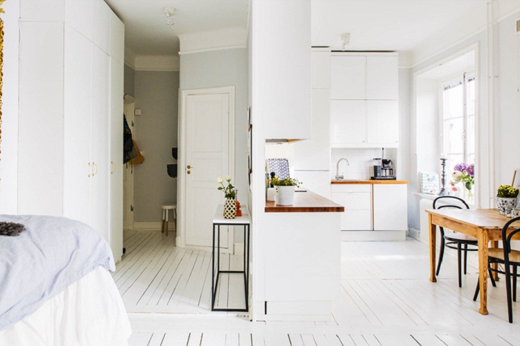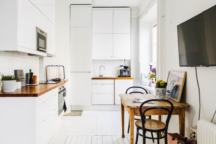 Nhà bếp chiếm một phần diện tích không nhỏ của ngôi nhà. Những chiếc tủ bếp được thiết kế để tận dụng triệt để chiều cao của căn hộ mang đến những ngăn tủ rộng thênh thang dùng chứa đồ. Dù chỉ là một căn hộ nhỏ nhưng bạn vẫn cảm thấy được sự thoải mái, thoáng đãng mà nó mang đến người ở. Sự lựa chọn chính sáng màu sơn hay nguồn ánh sáng tự nhiên phong phú góp phần không nhỏ đến mang đến cảm nhận đó.