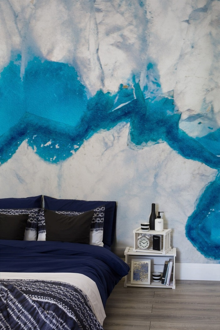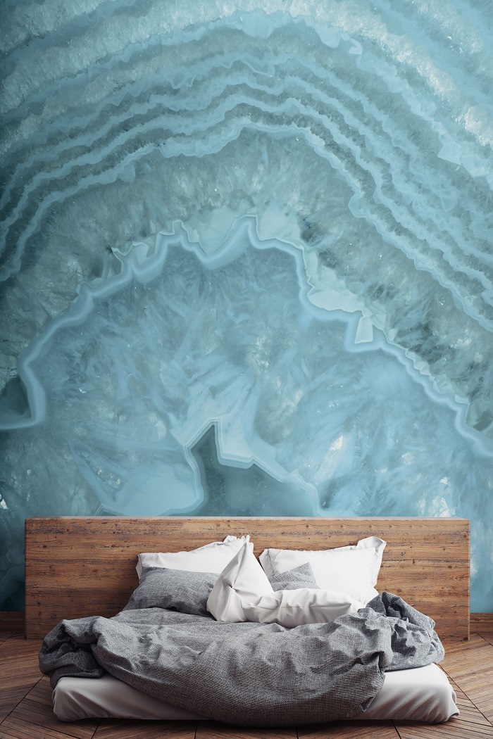 Một bức tường có màu bạc hà chèn lên lớp tinh thể màu xanh dương làm tăng độ sâu và hút mắt cho không gian.