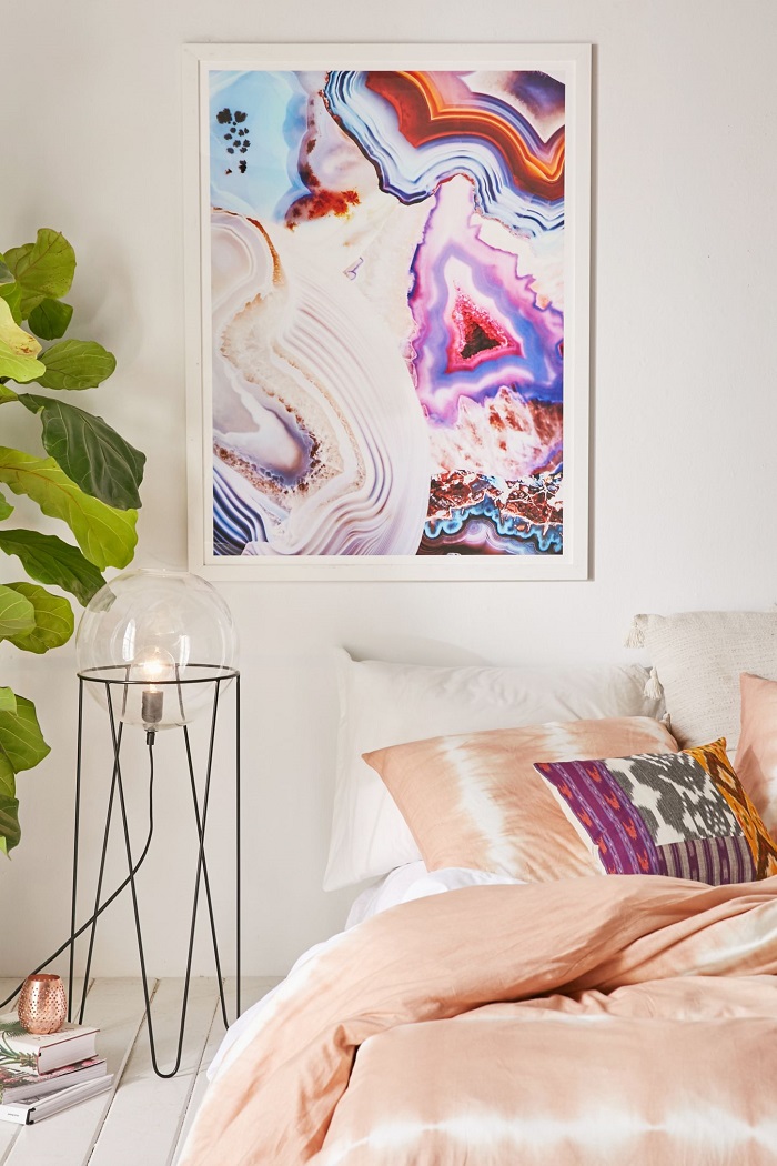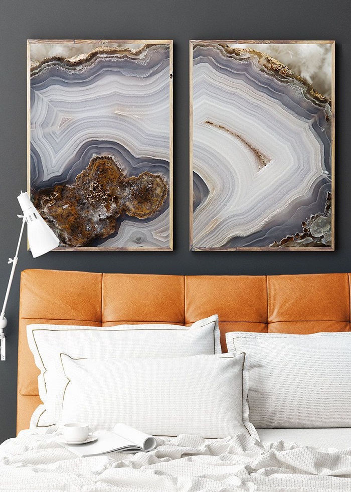 Một bộ đôi tác phẩm nghệ thuật về tinh hốc được đóng khung treo trên đầu giường ngủ mang lại cảm giác hiện đại.